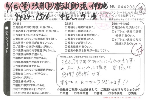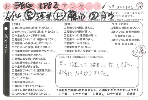 引越一番でお引越しをしていただいたお客様のうち、コメントいただいたアンケートを全て掲載しています。