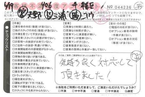 3/3 引越 営業:浅井 ドライバー:藤田 スタッフ:楊* 特にないです。ありがとうございました!