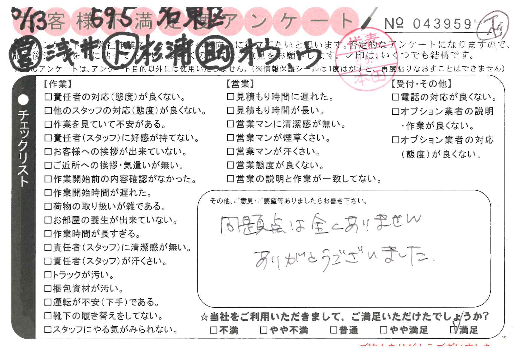 引越一番でお引越しをしていただいたお客様のうち、コメントいただいたアンケートを全て掲載しています。