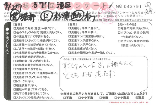 引越一番でお引越しをしていただいたお客様のうち、コメントいただいたアンケートを全て掲載しています。