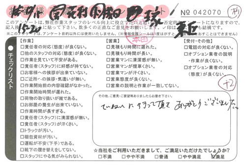 引越一番でお引越しをしていただいたお客様のうち、コメントいただいたアンケートを全て掲載しています。