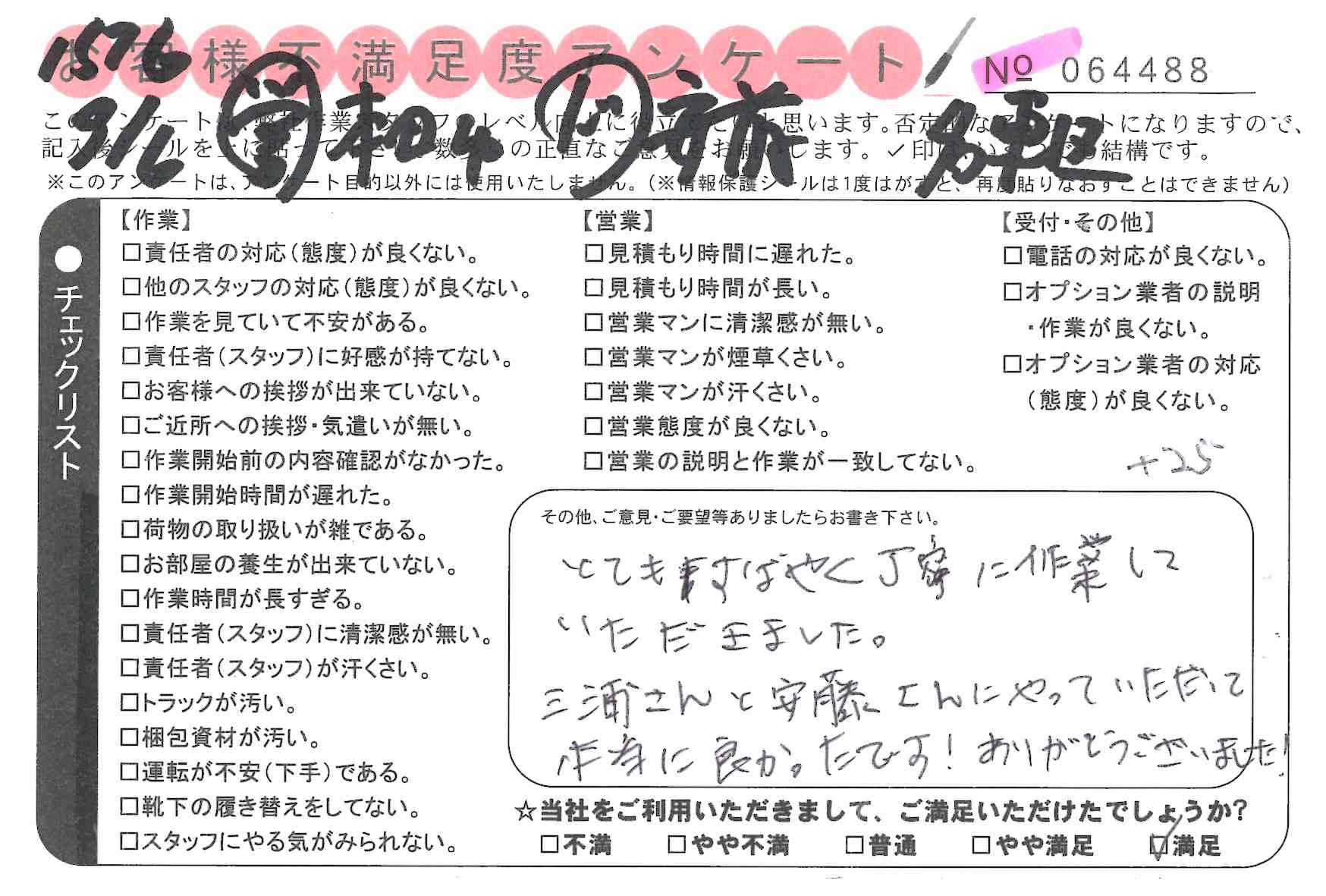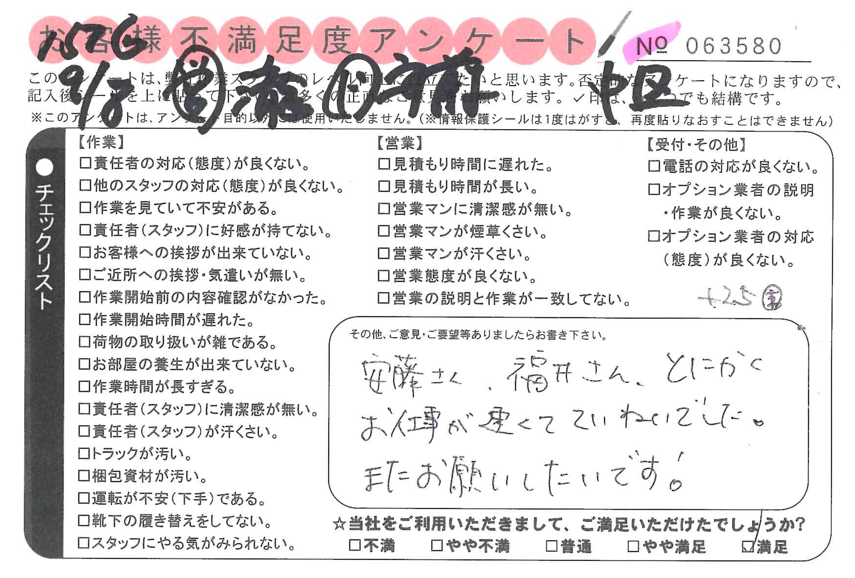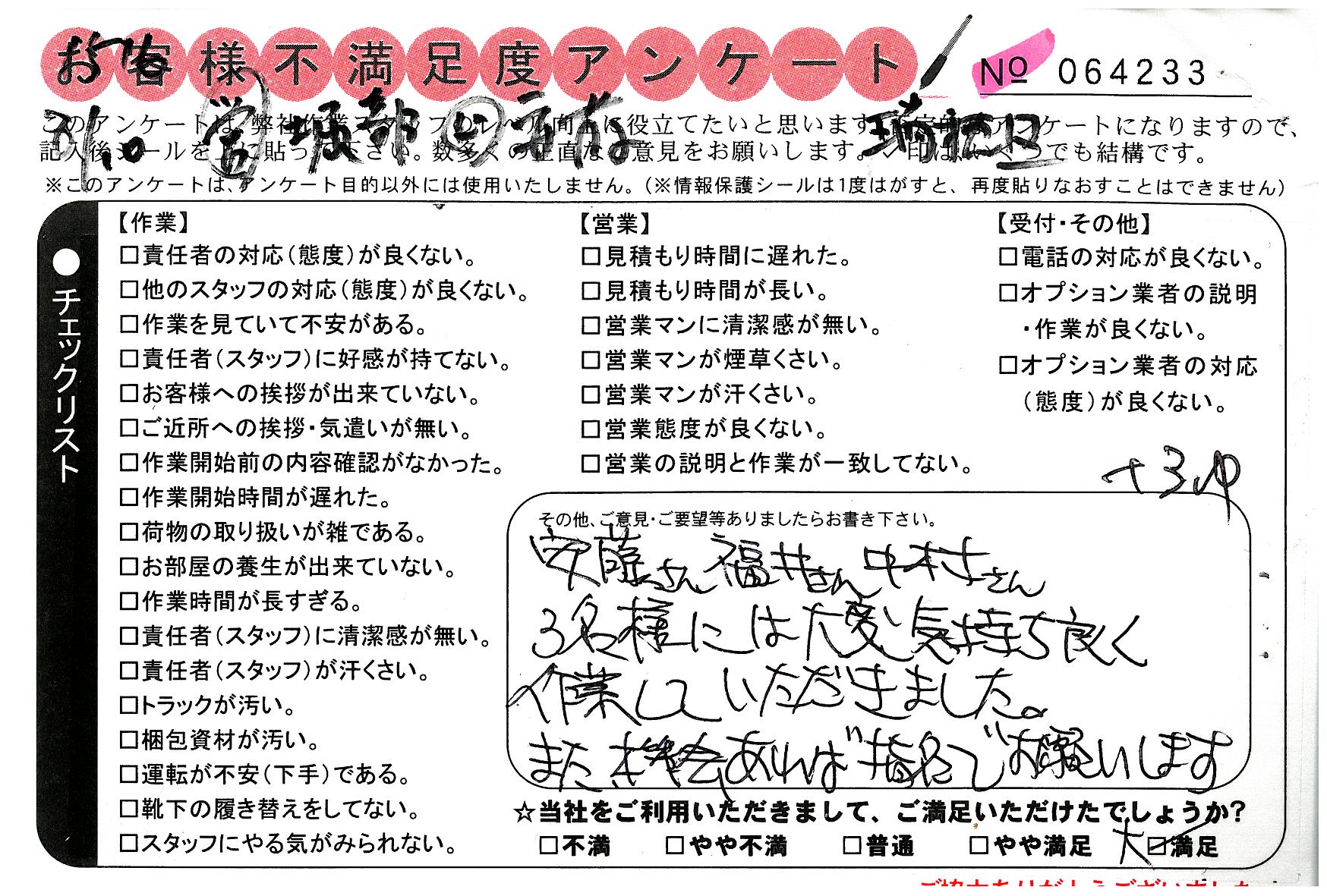 引越一番でお引越しをしていただいたお客様のうち、コメントいただいたアンケートを全て掲載しています。