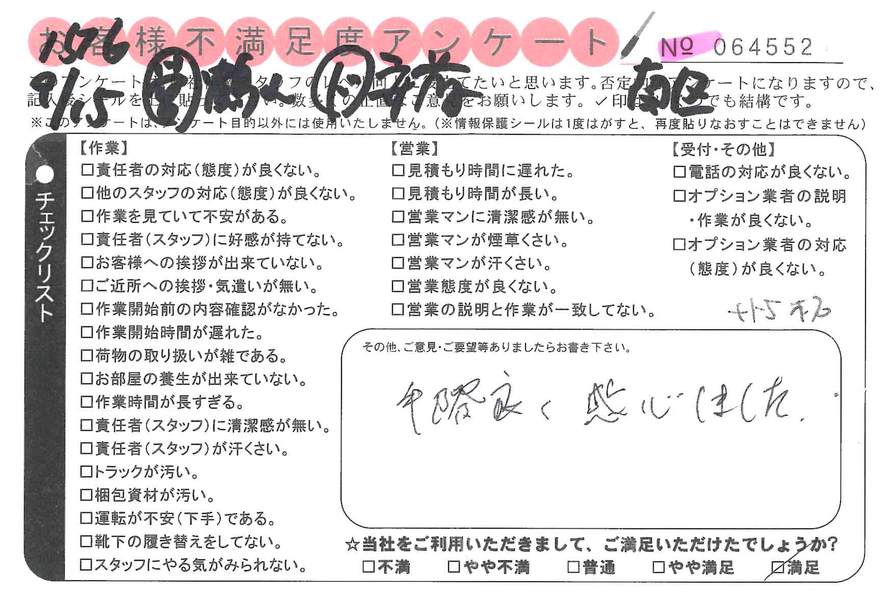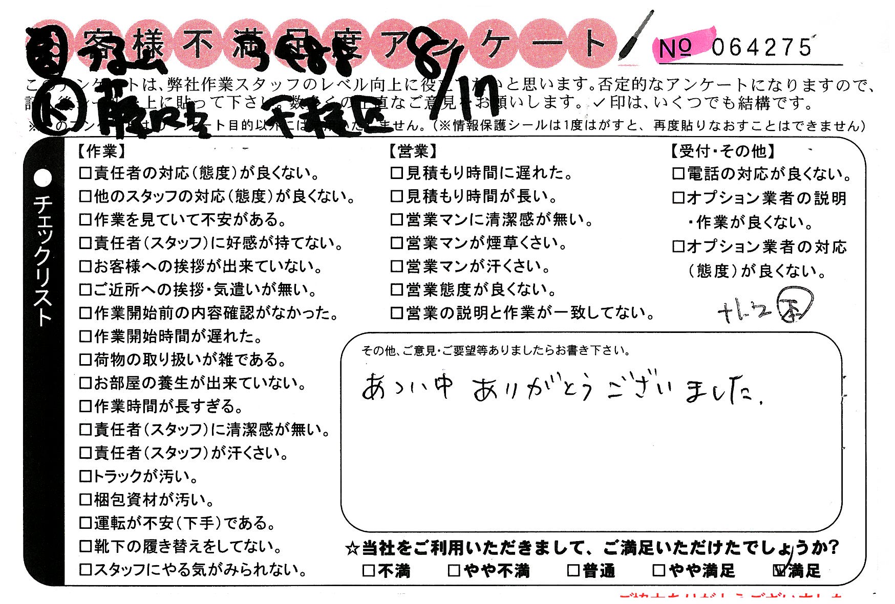 不満足度アンケートを行っている引越一番では、不評なアンケートも、好評なアンケートも全て掲載しています。