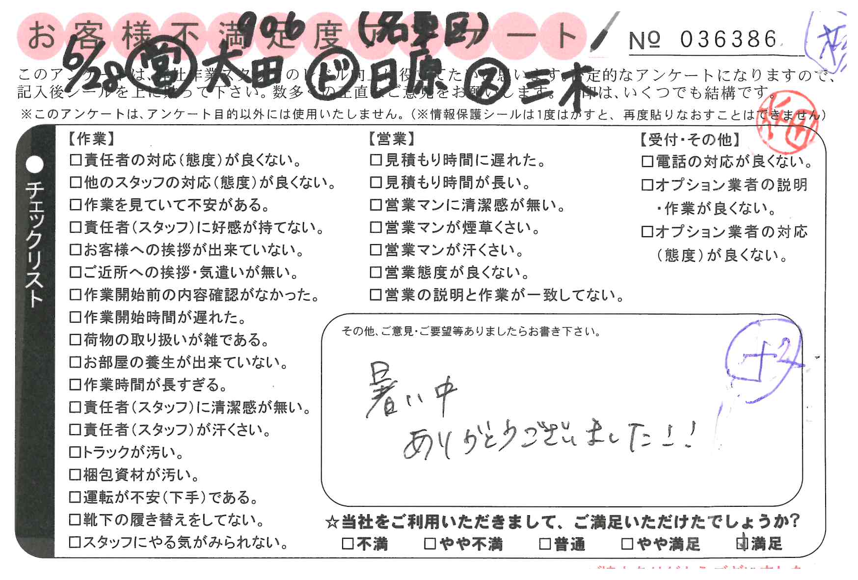 引越一番でお引越しをしていただいたお客様のうち、コメントいただいたアンケートを全て掲載しています。