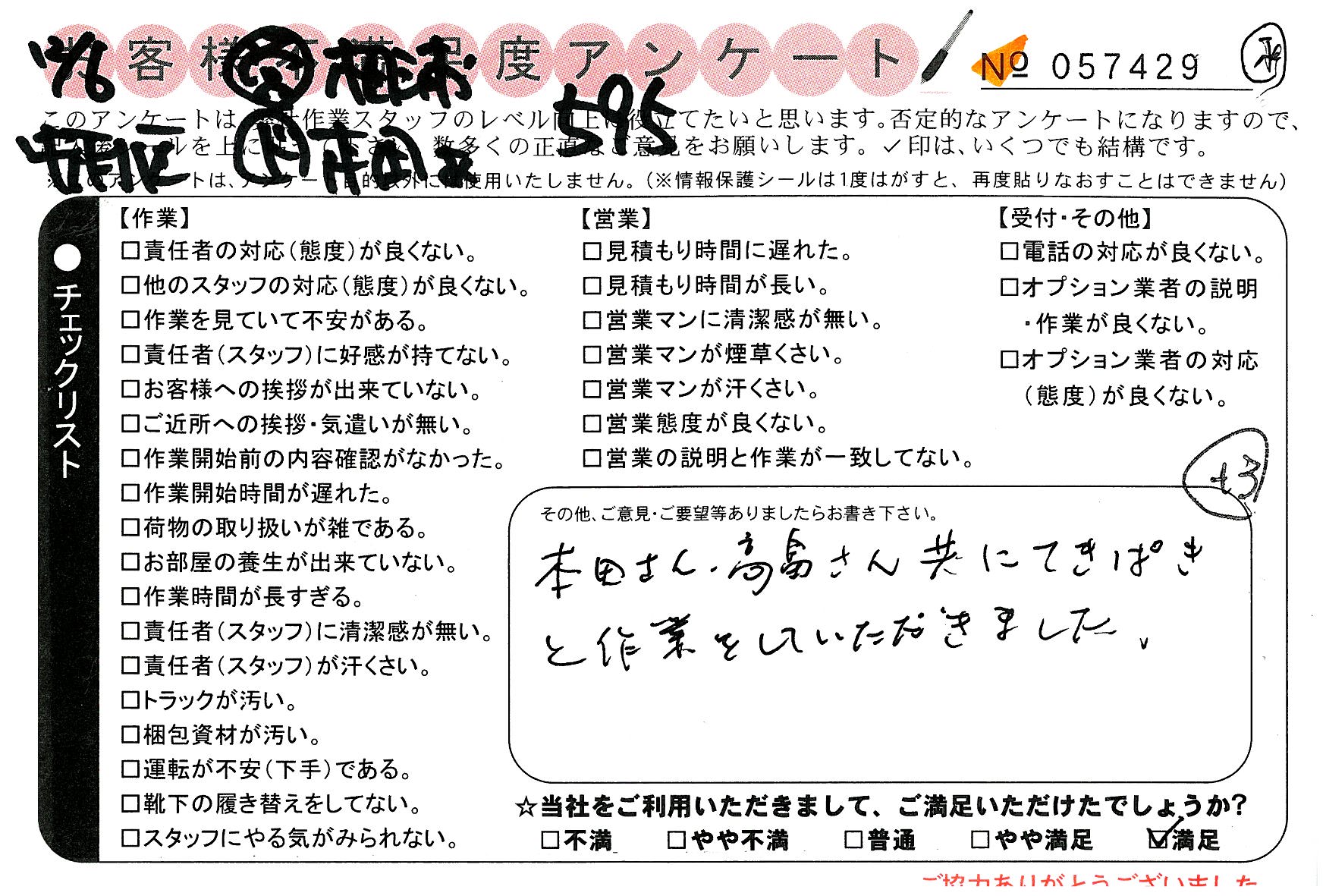 引越一番でお引越しをしていただいたお客様のうち、コメントいただいたアンケートを全て掲載しています。