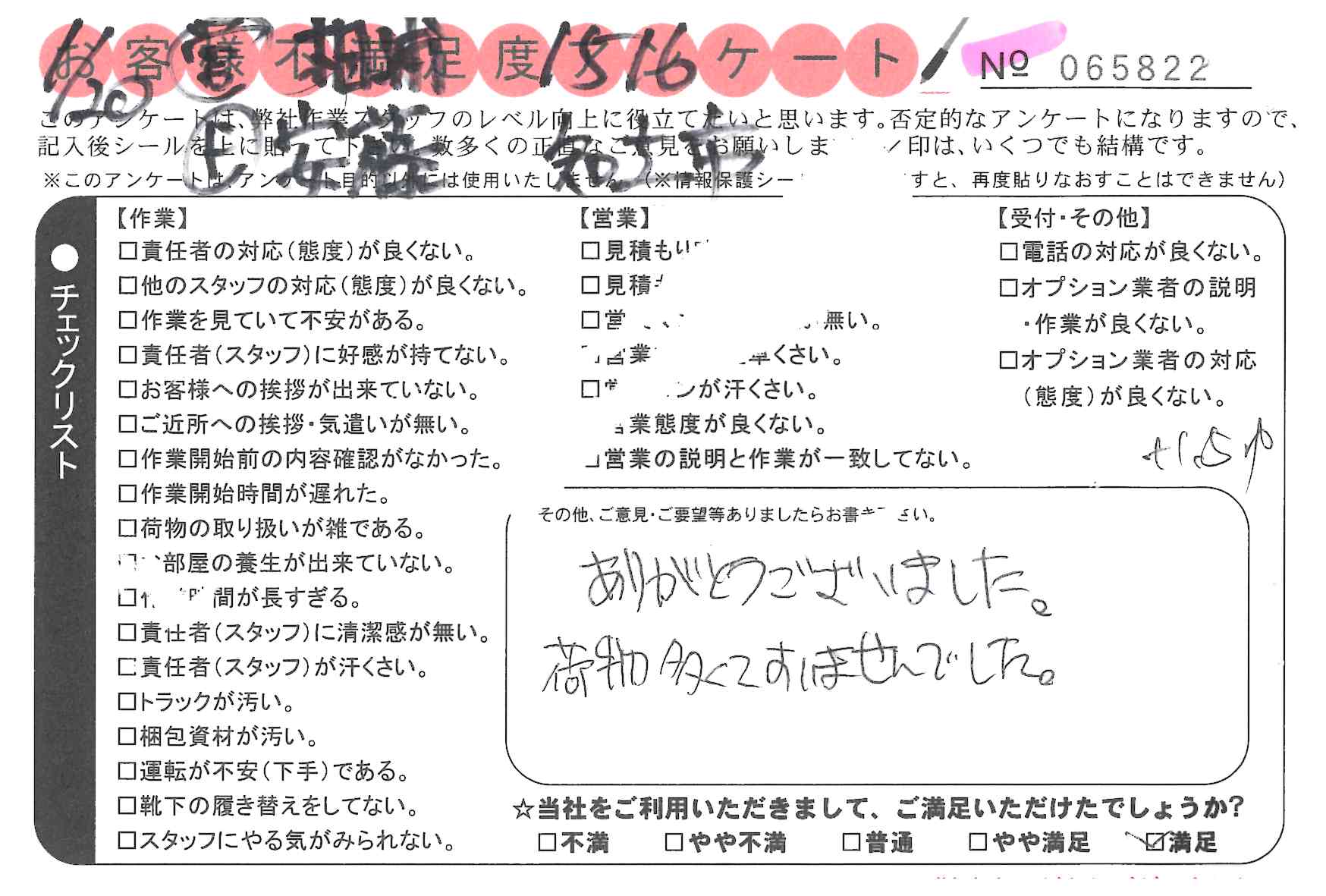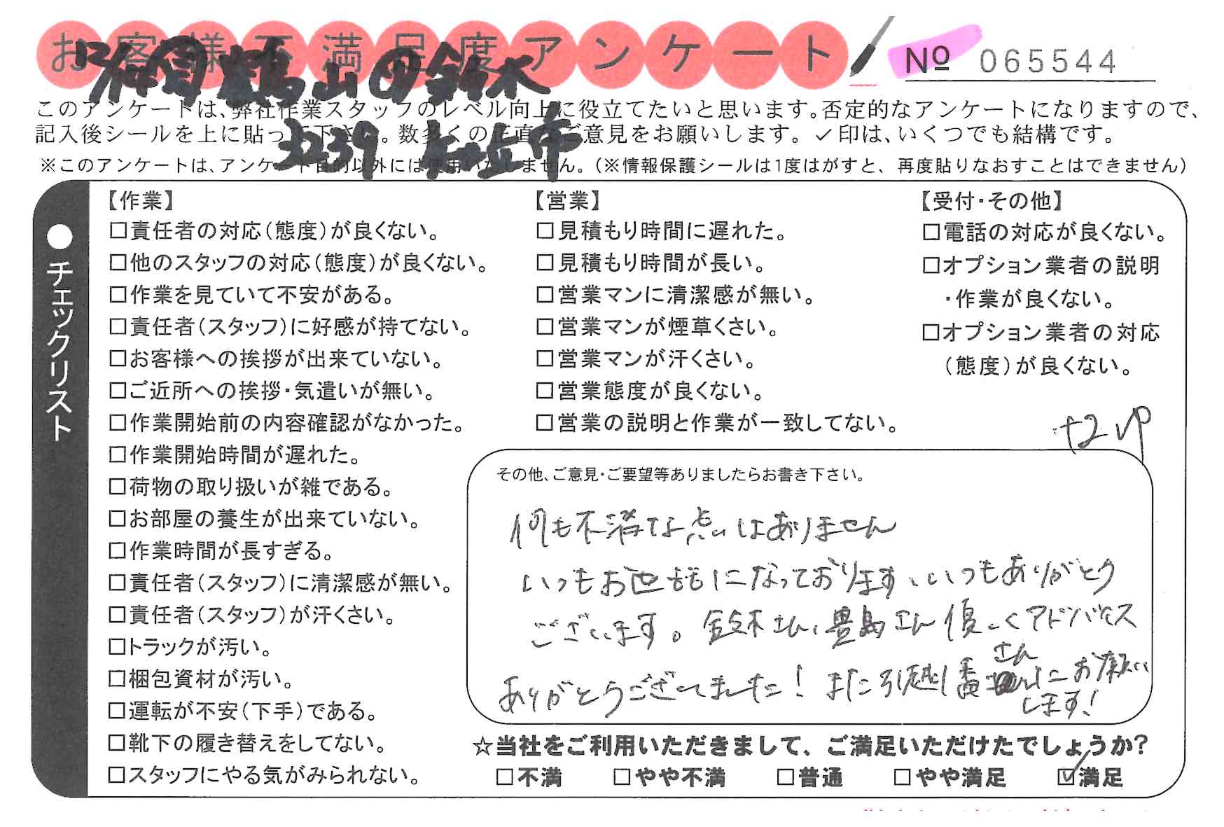 * 何も不満な点はありません。いつもお世話になっております。