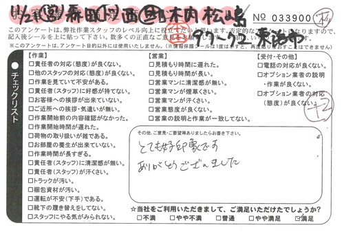 4/7引越 営業:青木 ドライバー:松嶋 スタッフ:戸蘭対応がとてもしんせつで、またお願いしたいと