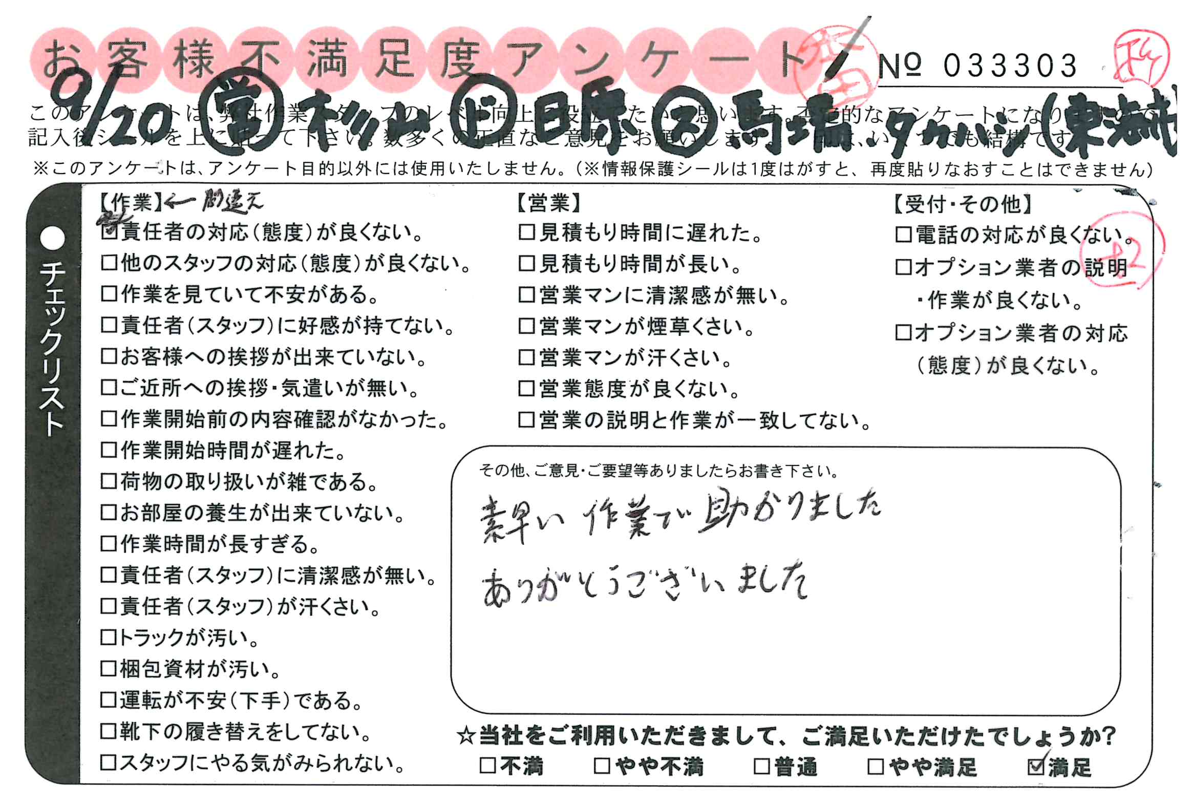 9/26 引越 営業:鶴山 ドライバー:鶴山 スタッフ:本名・高* 大変早く、作業をして頂き大満足です。友人・知人