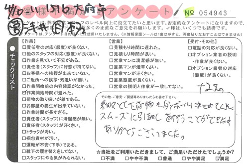 引越一番でお引越しをしていただいたお客様のうち、コメントいただいたアンケートを全て掲載しています。