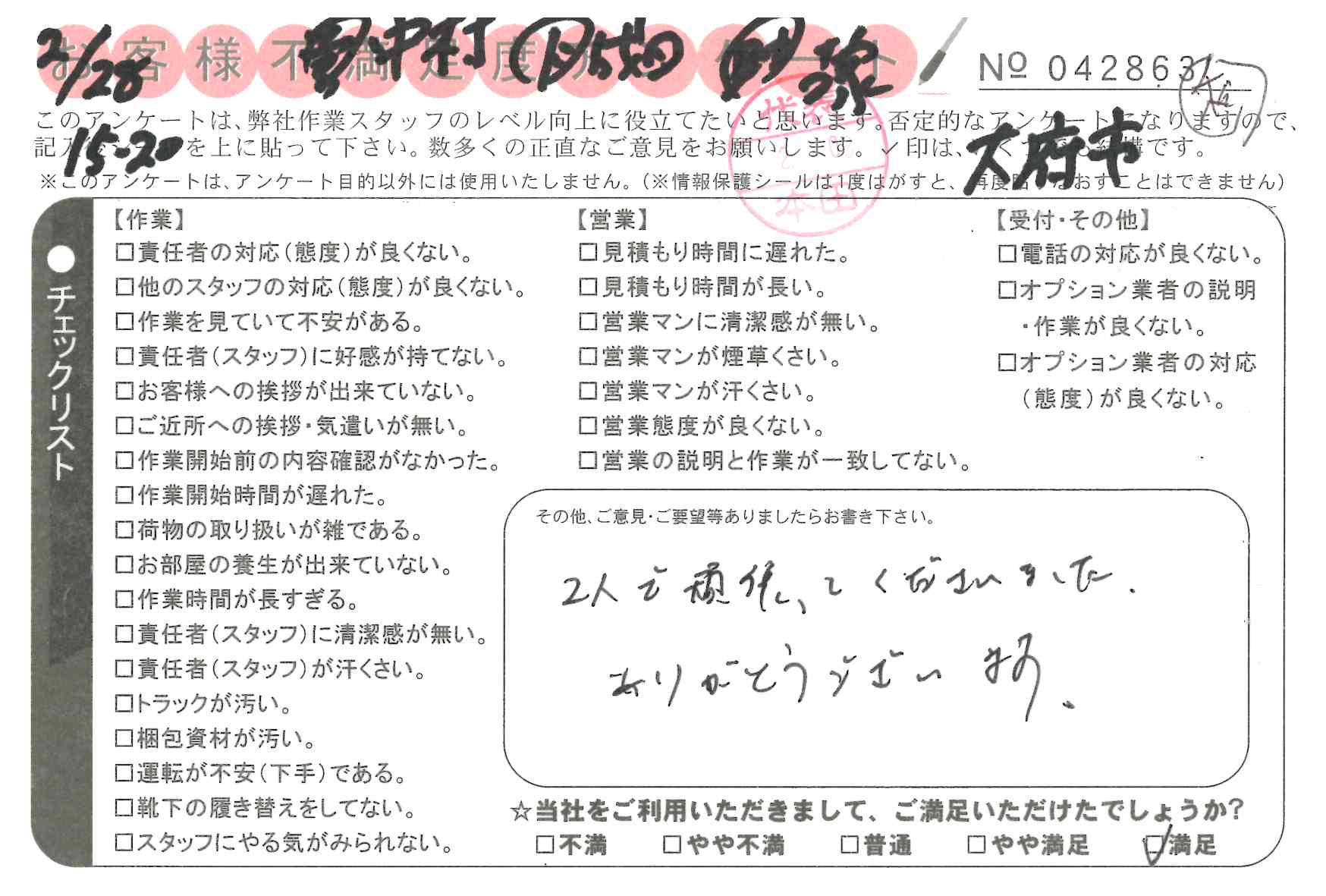 2/26 引越 営業:花村 ドライバー:安藤 スタッフ:ホウ・川畑* 特になし。強いて言うと、荷物包む布が少し汚れて