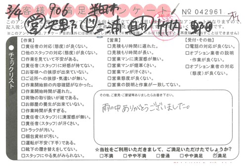 引越一番でお引越しをしていただいたお客様のうち、コメントいただいたアンケートを全て掲載しています。