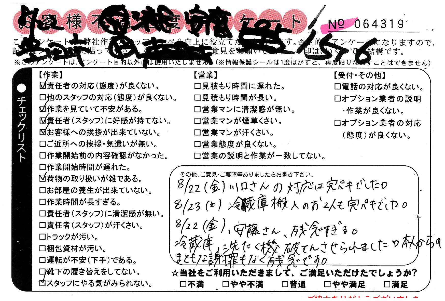 8/22(金)、安藤さん残念すぎる。冷蔵庫、洗たく機 破そん