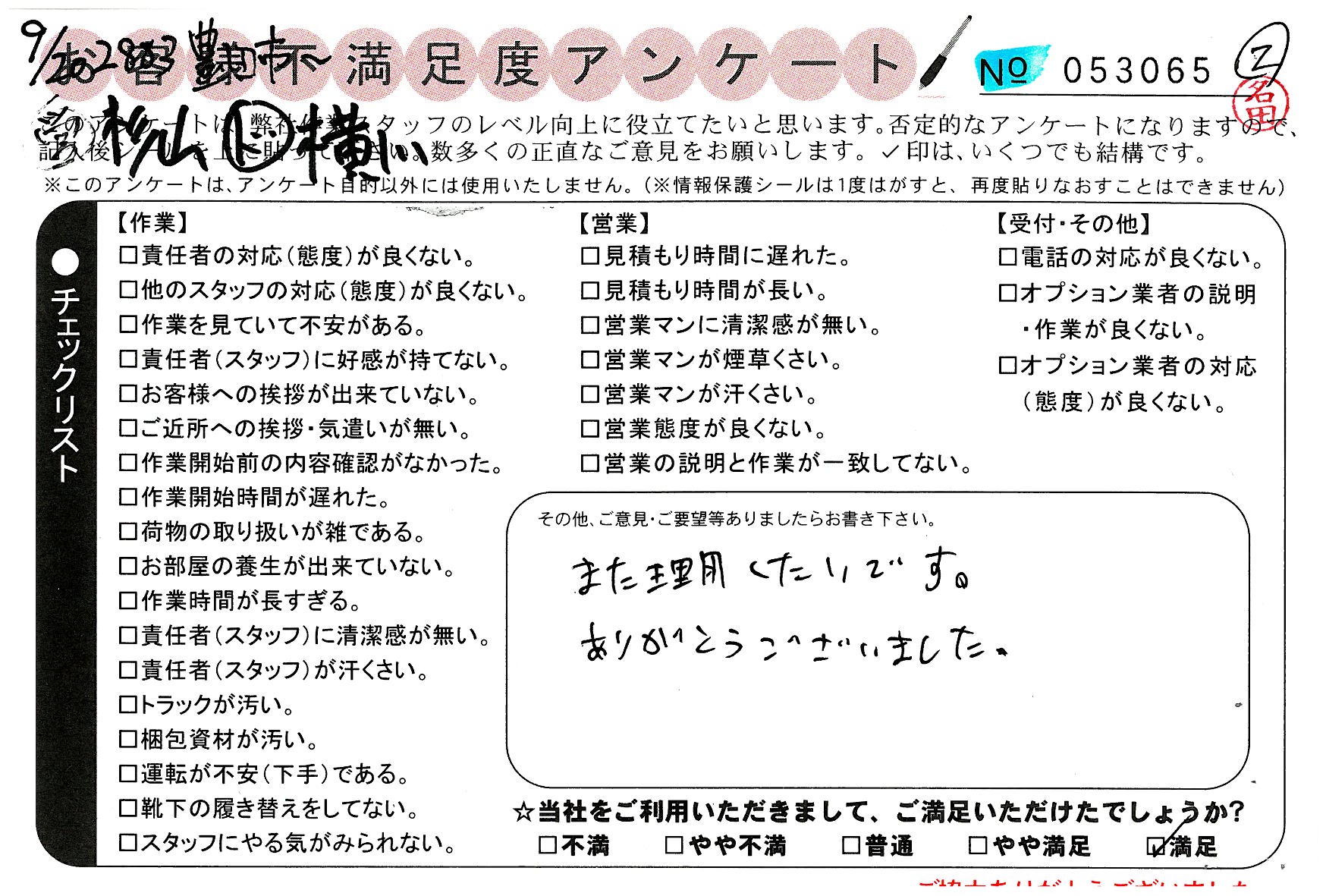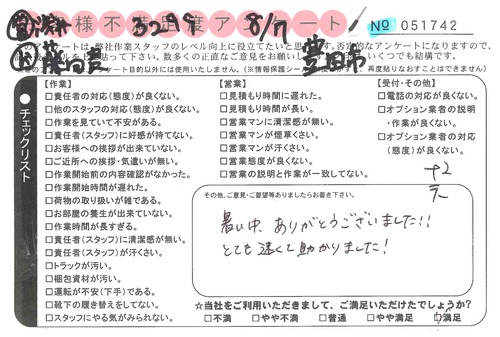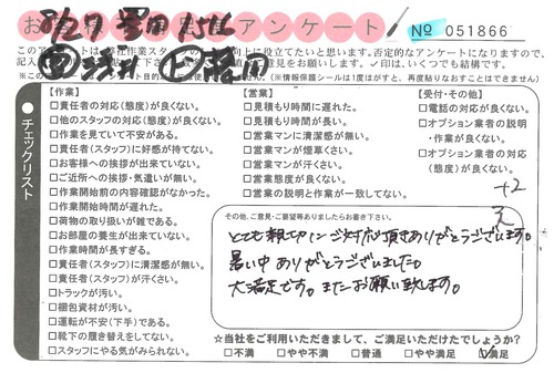 引越一番でお引越しをしていただいたお客様のうち、コメントいただいたアンケートを全て掲載しています。