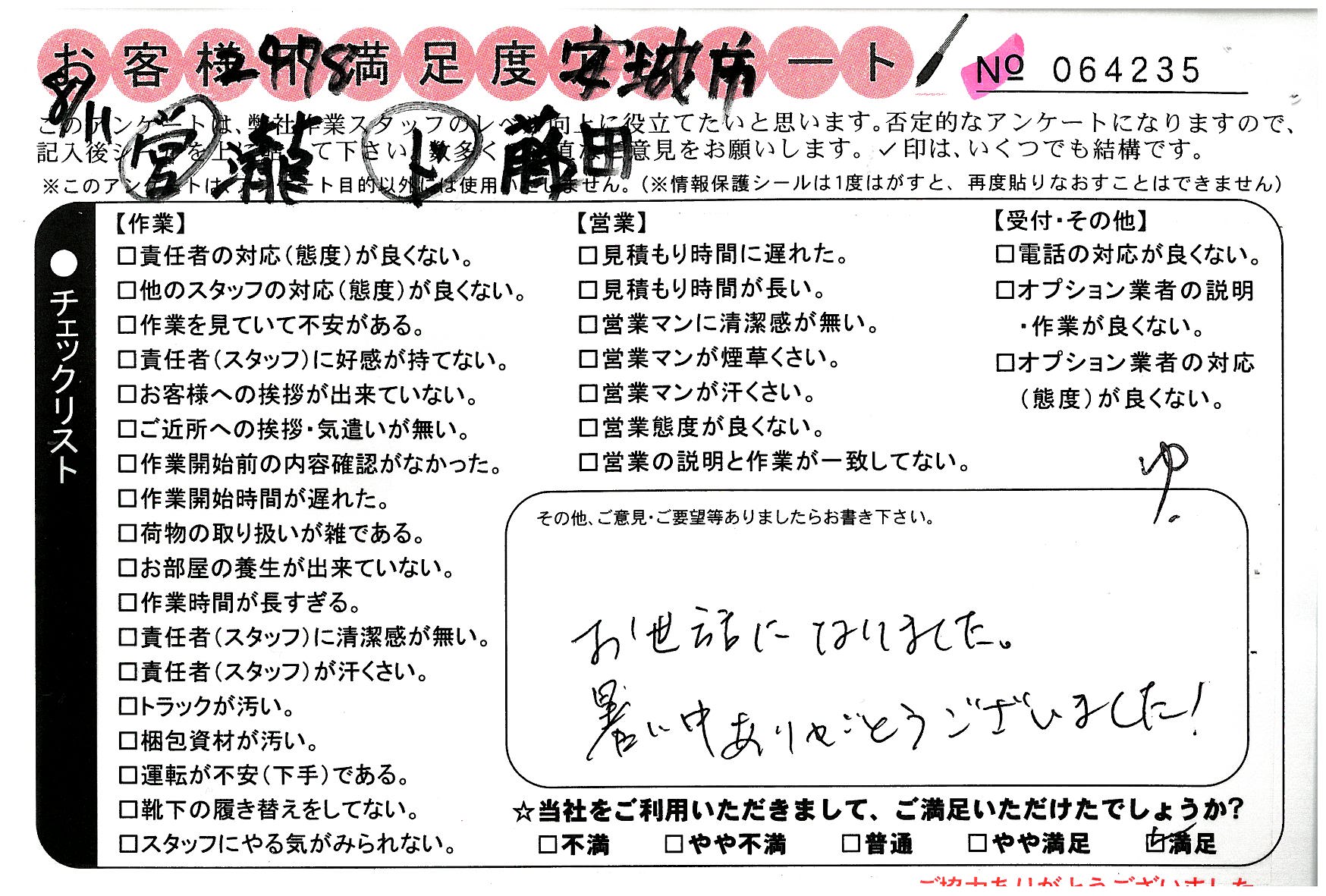 引越一番でお引越しをしていただいたお客様のうち、コメントいただいたアンケートを全て掲載しています。