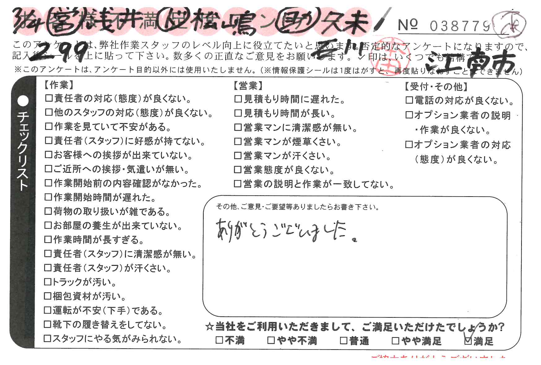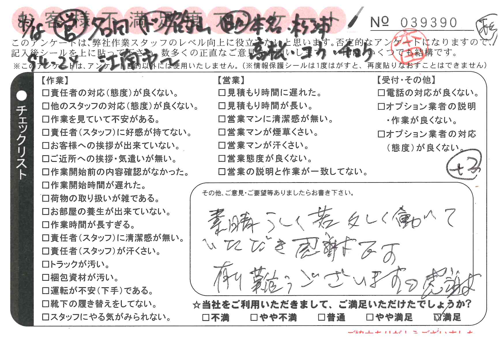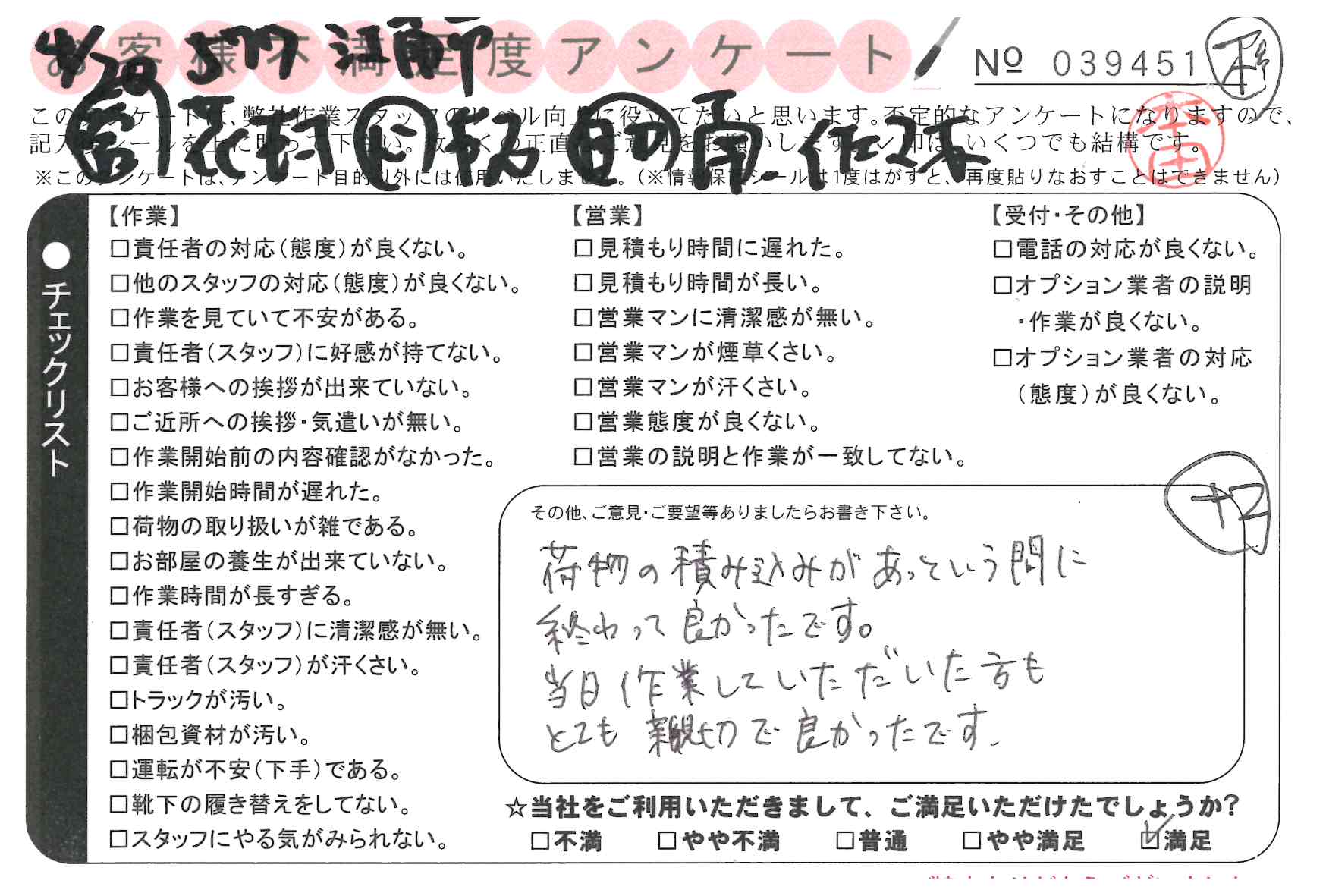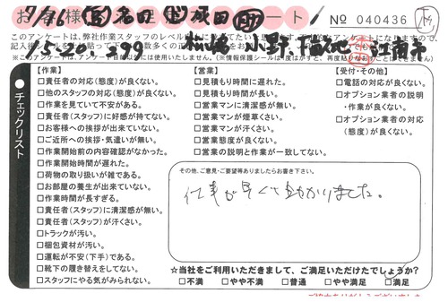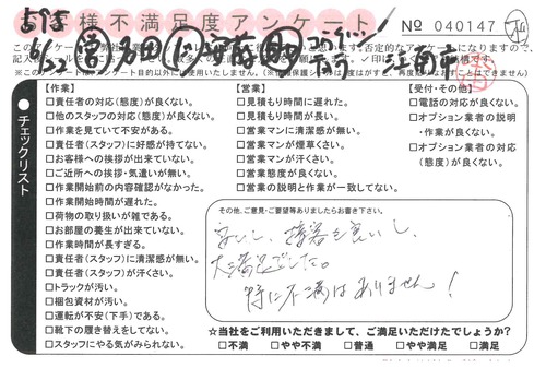 引越一番でお引越しをしていただいたお客様のうち、コメントいただいたアンケートを全て掲載しています。