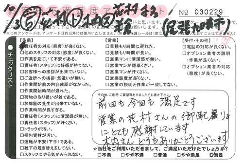 3/24 引越 営業:花村 ドライバー:本名 スタッフ:近藤・鈴木・岡本* とてもスピーディーにやって頂いて満足です。