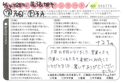 引越一番でお引越しをしていただいたお客様のうち、コメントいただいたアンケートを全て掲載しています。