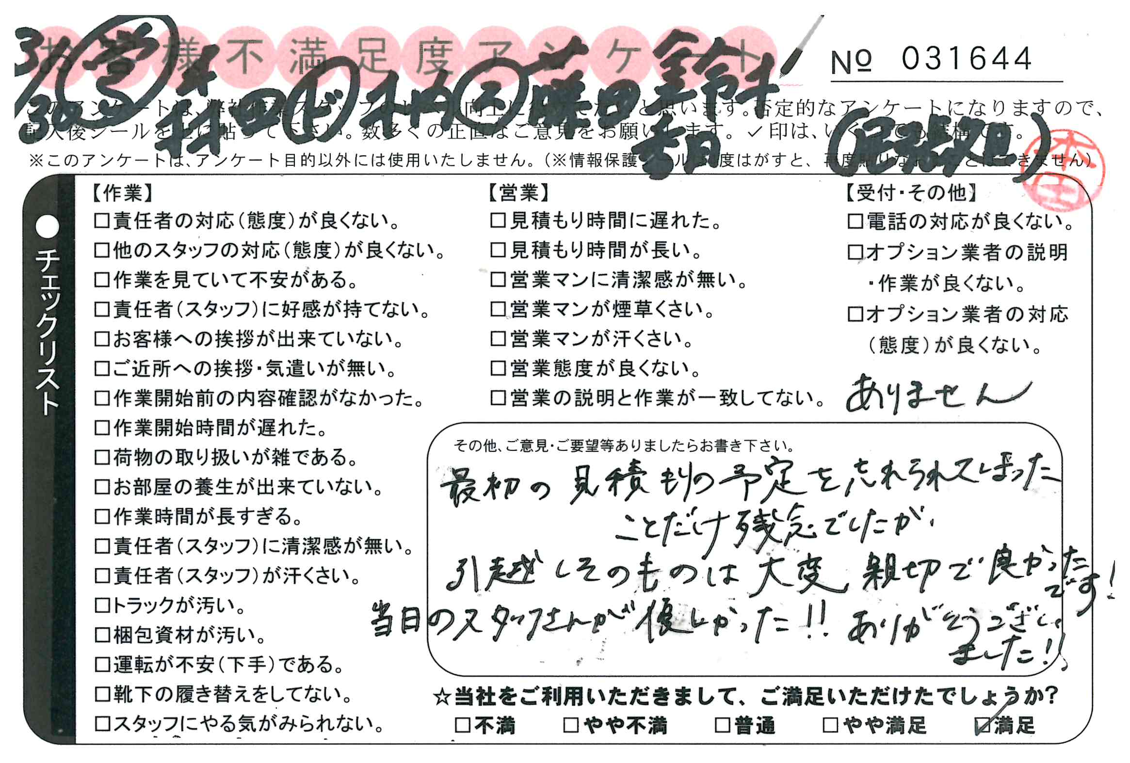 2/23 引越 営業:花村 ドライバー:本名 スタッフ:吉岡* 最初の営業さん以外は満足です。