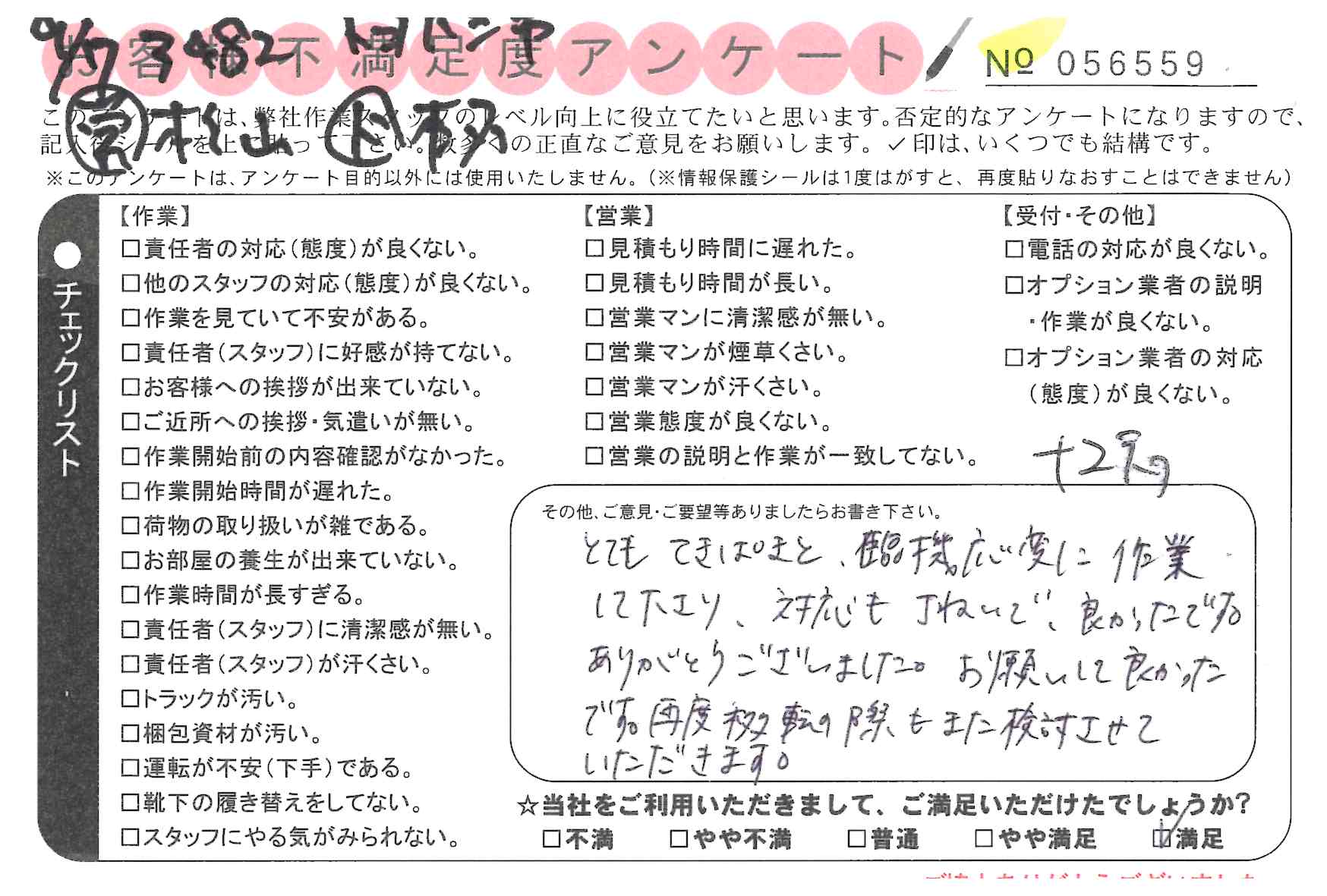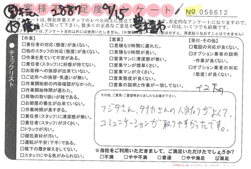 引越一番でお引越しをしていただいたお客様のうち、コメントいただいたアンケートを全て掲載しています。