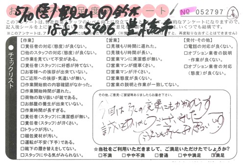 引越一番でお引越しをしていただいたお客様のうち、コメントいただいたアンケートを全て掲載しています。