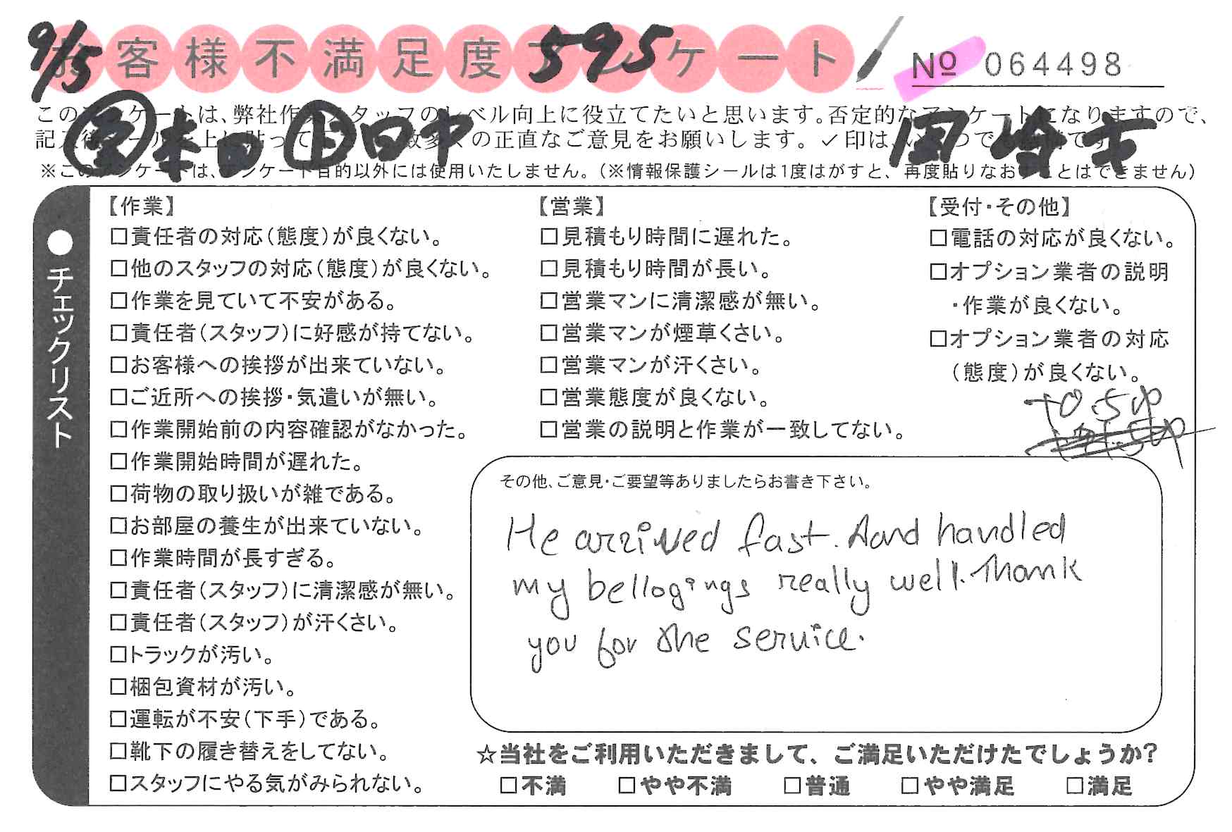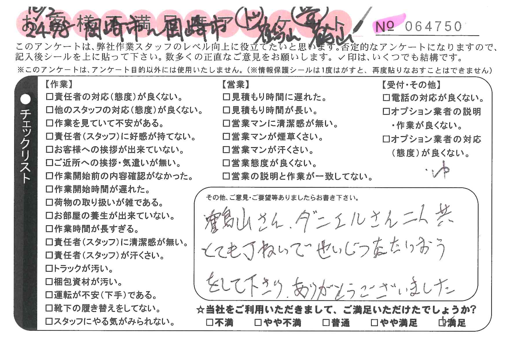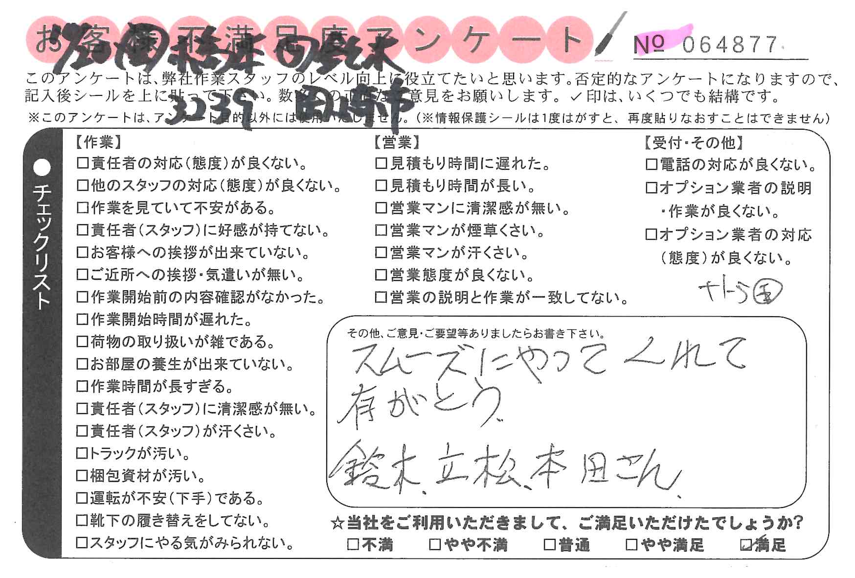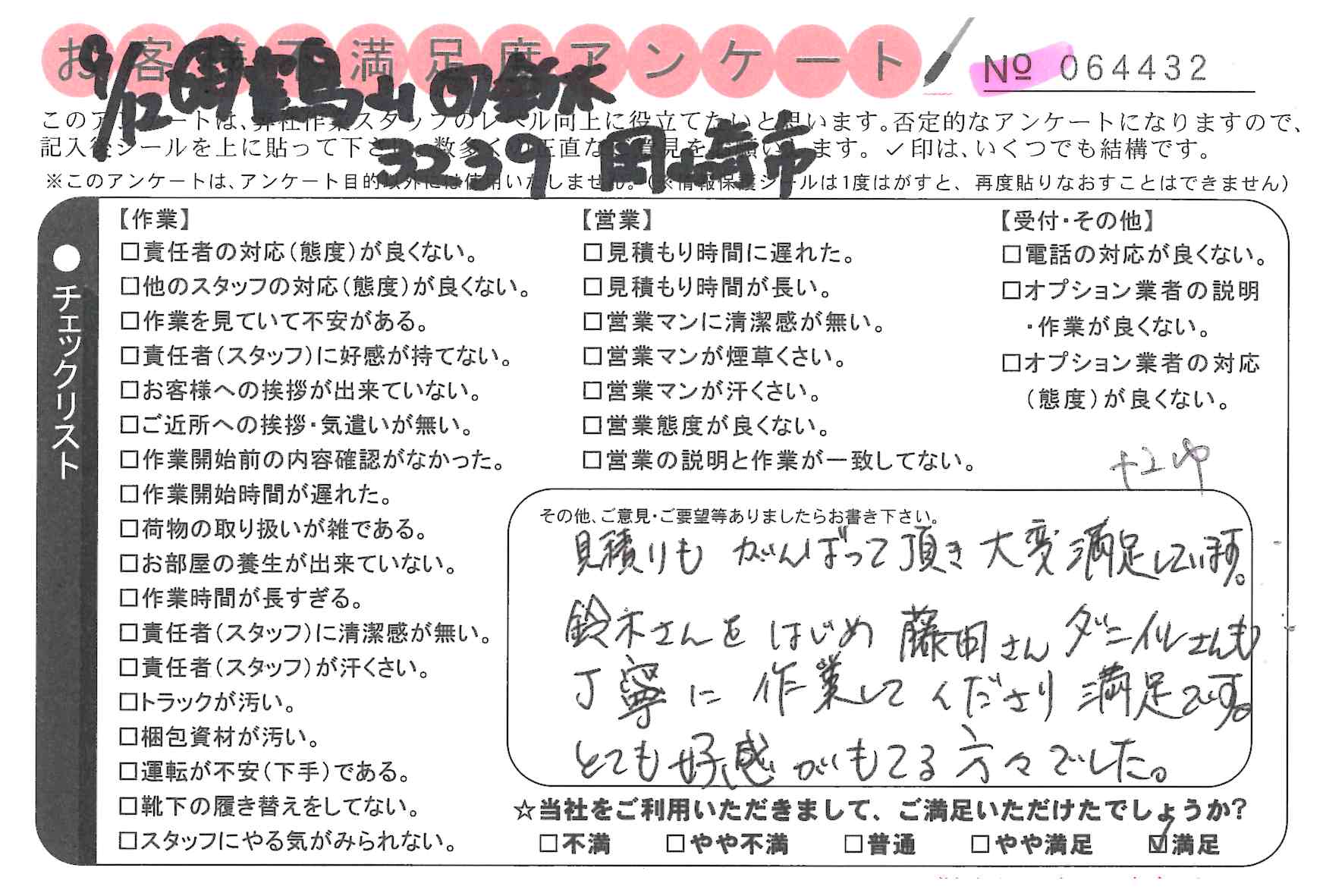 引越一番でお引越しをしていただいたお客様のうち、コメントいただいたアンケートを全て掲載しています。