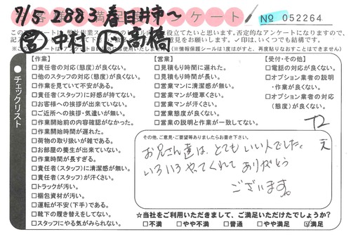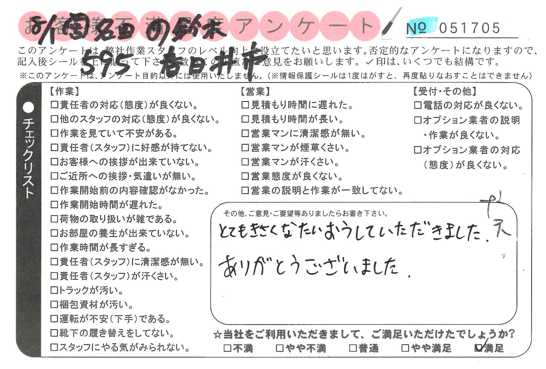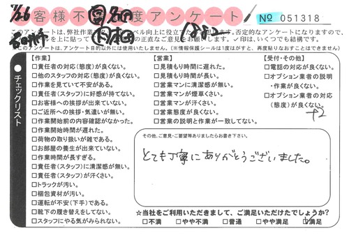引越一番でお引越しをしていただいたお客様のうち、コメントいただいたアンケートを全て掲載しています。