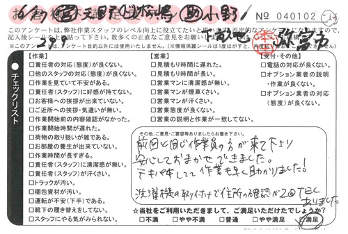 10/4 引越 営業:天野 ドライバー:安藤 スタッフ:高・オウ* 特に気になった点はありませんでした。作業も