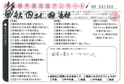 3/8 引越 営業:本名 ドライバー:米倉 スタッフ:渡部* 部屋の養生が一切なかった。