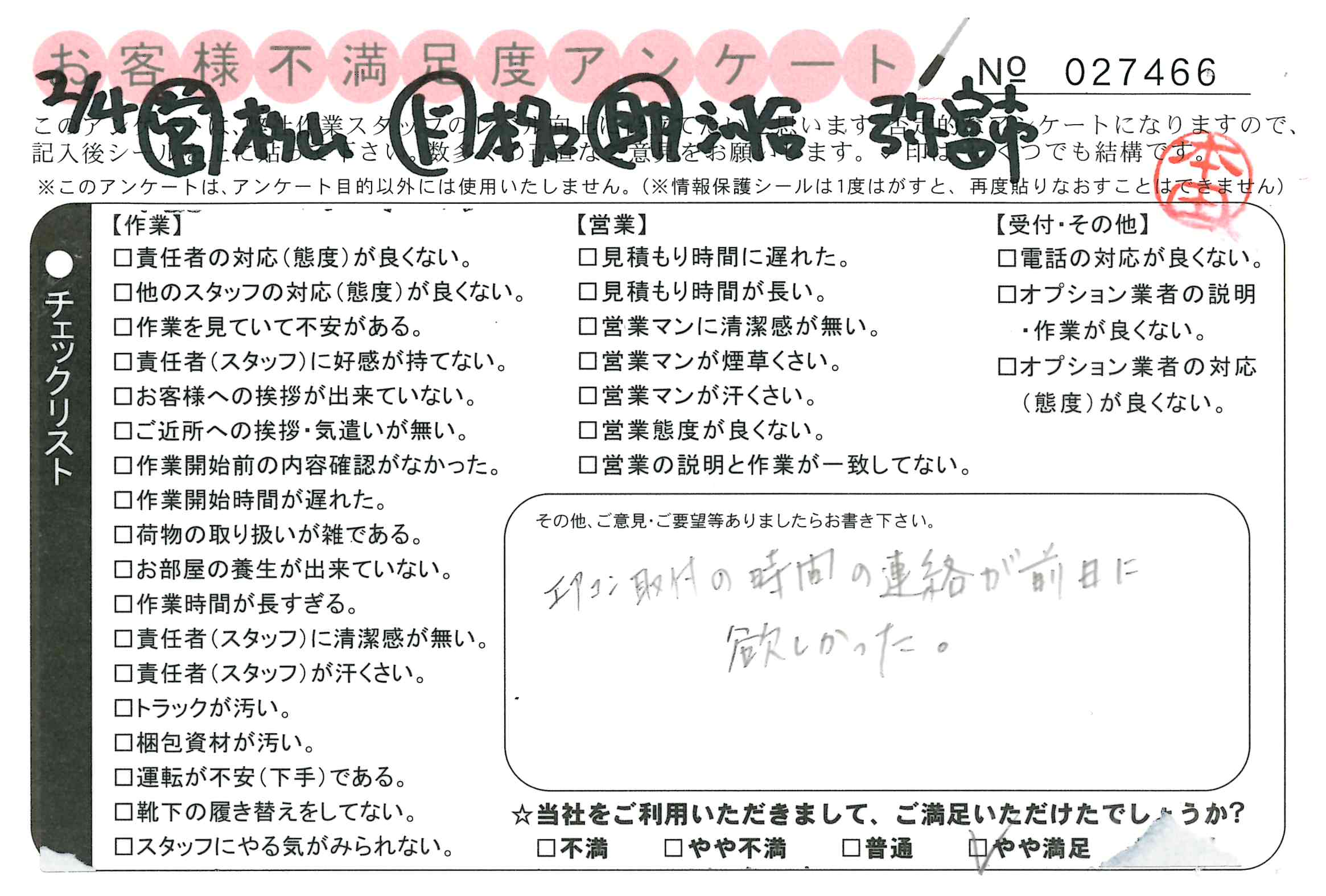 4/23 引越 営業:鶴山 ドライバー:三浦 スタッフ:小野* 見積りの日時に手順が整っていなく、当日