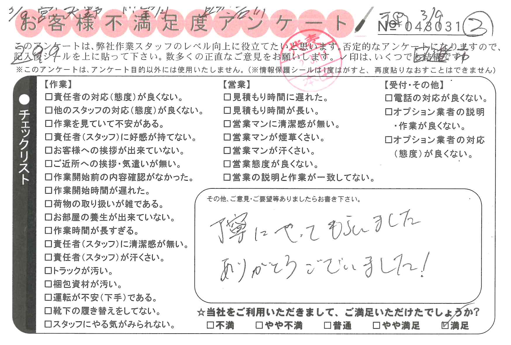 3/30 引越 営業:杉山 ドライバー:鈴木 スタッフ:石川* 早くて助かりました。