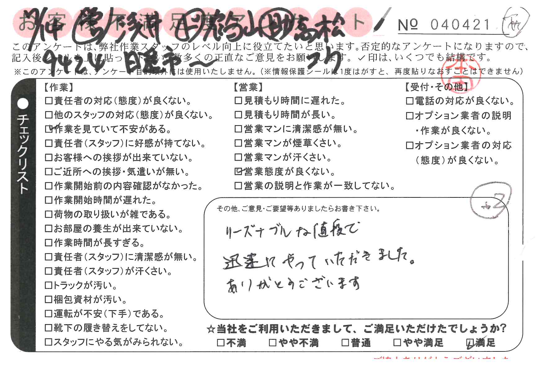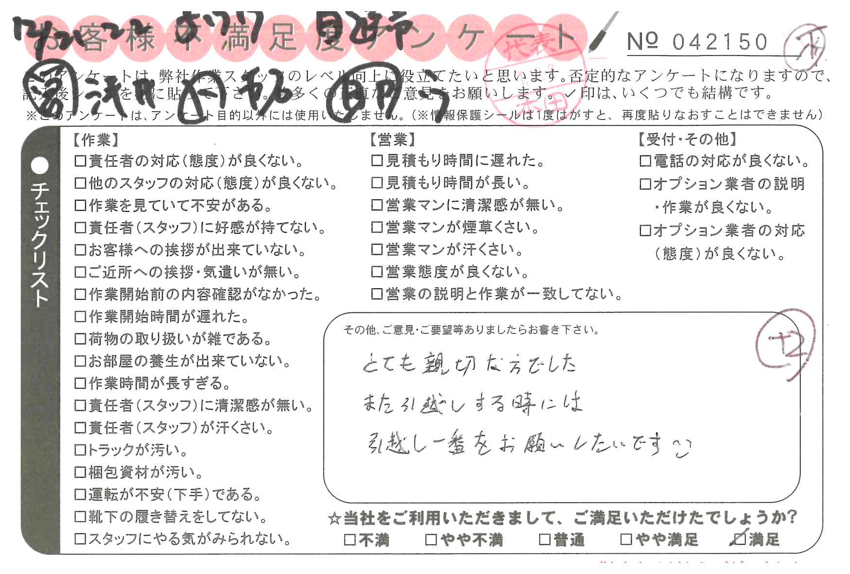 引越一番でお引越しをしていただいたお客様のうち、コメントいただいたアンケートを全て掲載しています。