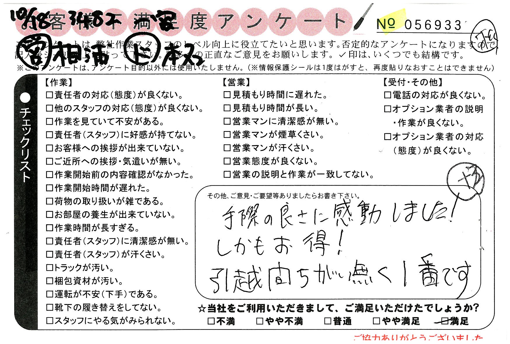 不満足度アンケートを行っている引越一番では、不評なアンケートも、好評なアンケートも全て掲載しています。