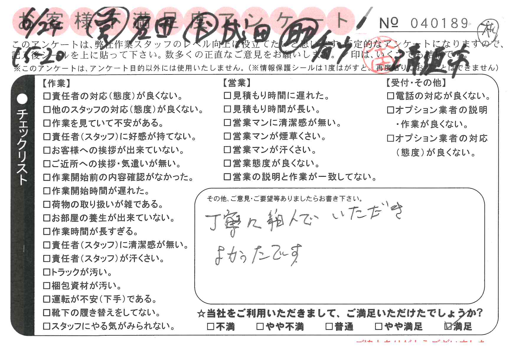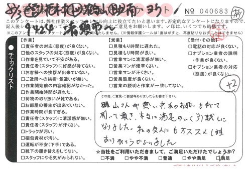 引越一番でお引越しをしていただいたお客様のうち、コメントいただいたアンケートを全て掲載しています。