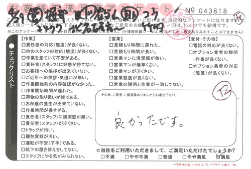 引越一番でお引越しをしていただいたお客様のうち、コメントいただいたアンケートを全て掲載しています。