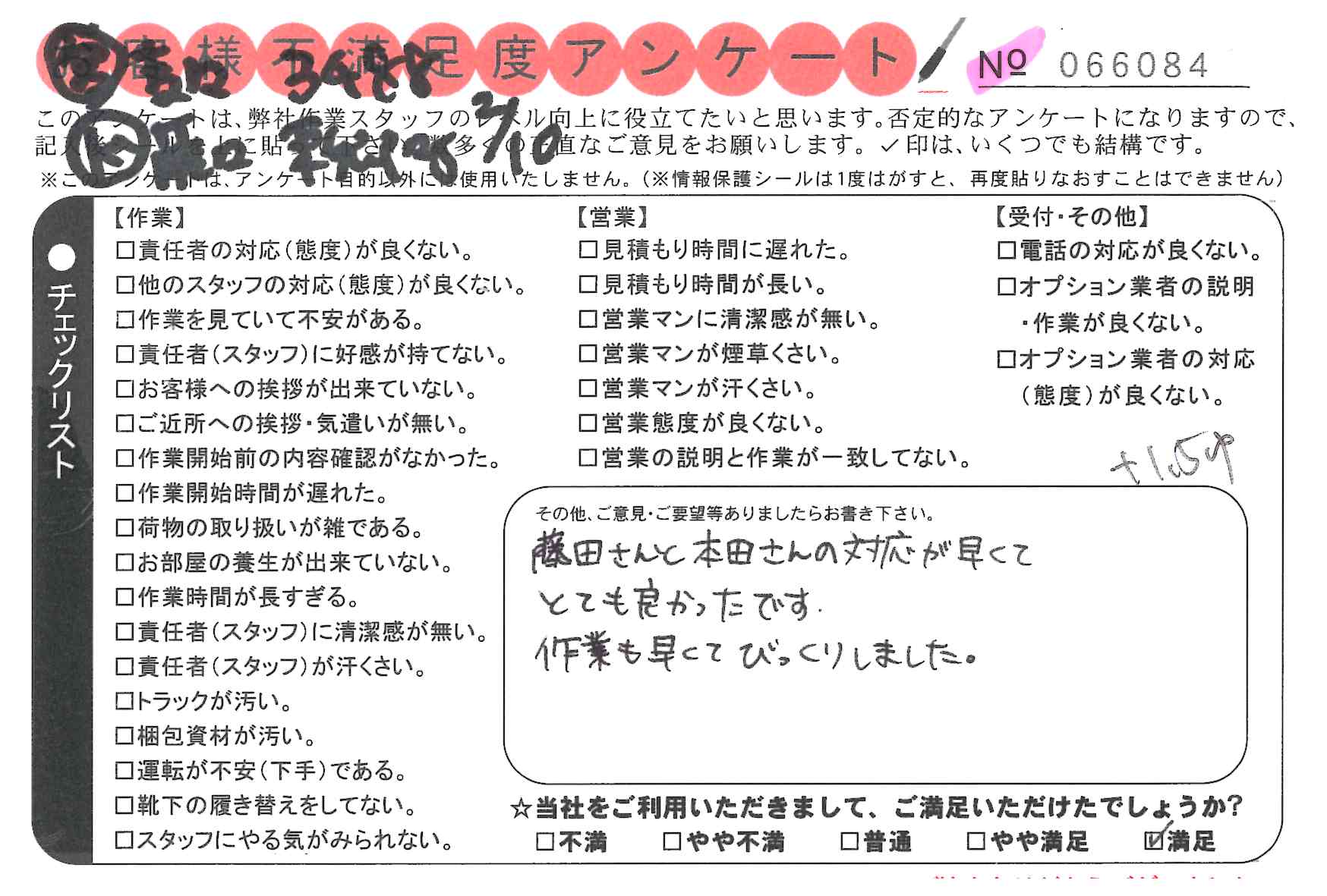 * 藤田さんと本田さんの対応が早くてとても良かったです。