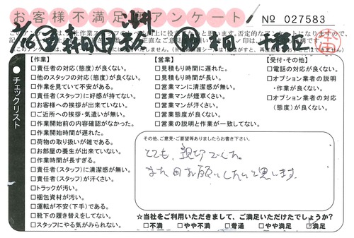 引越一番でお引越しをしていただいたお客様のうち、コメントいただいたアンケートを全て掲載しています。