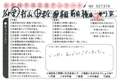 引越一番でお引越しをしていただいたお客様のうち、コメントいただいたアンケートを全て掲載しています。