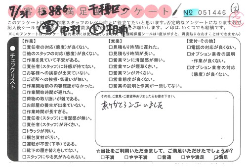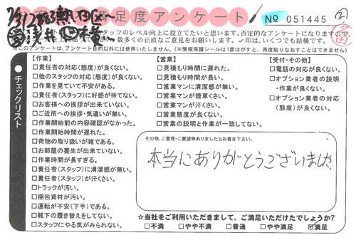 引越一番でお引越しをしていただいたお客様のうち、コメントいただいたアンケートを全て掲載しています。