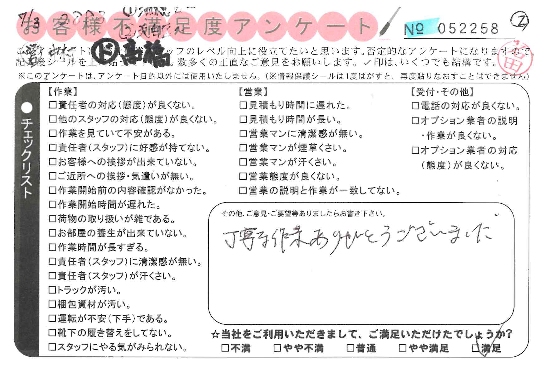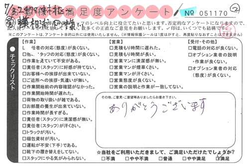 引越一番でお引越しをしていただいたお客様のうち、コメントいただいたアンケートを全て掲載しています。