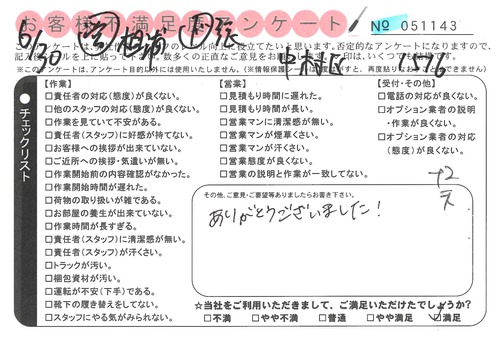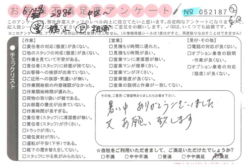 引越一番でお引越しをしていただいたお客様のうち、コメントいただいたアンケートを全て掲載しています。