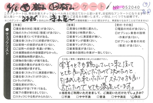 引越一番でお引越しをしていただいたお客様のうち、コメントいただいたアンケートを全て掲載しています。
