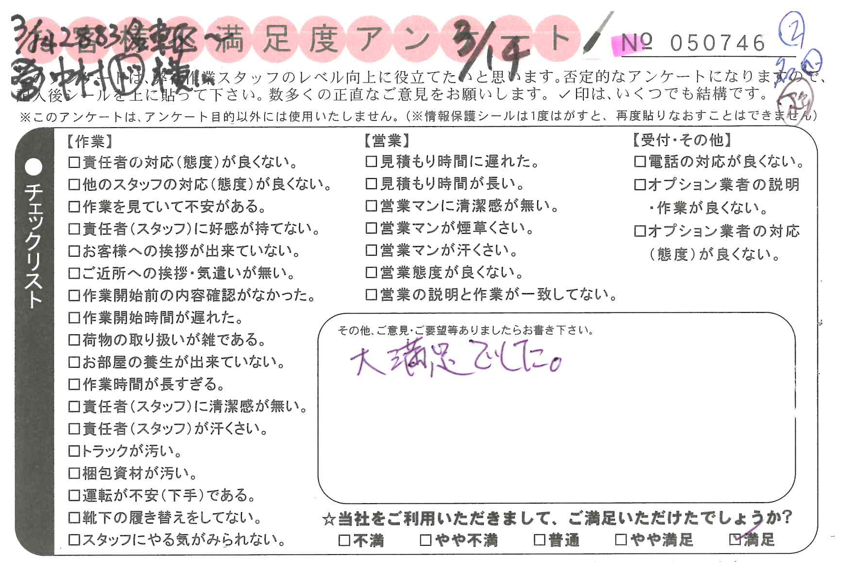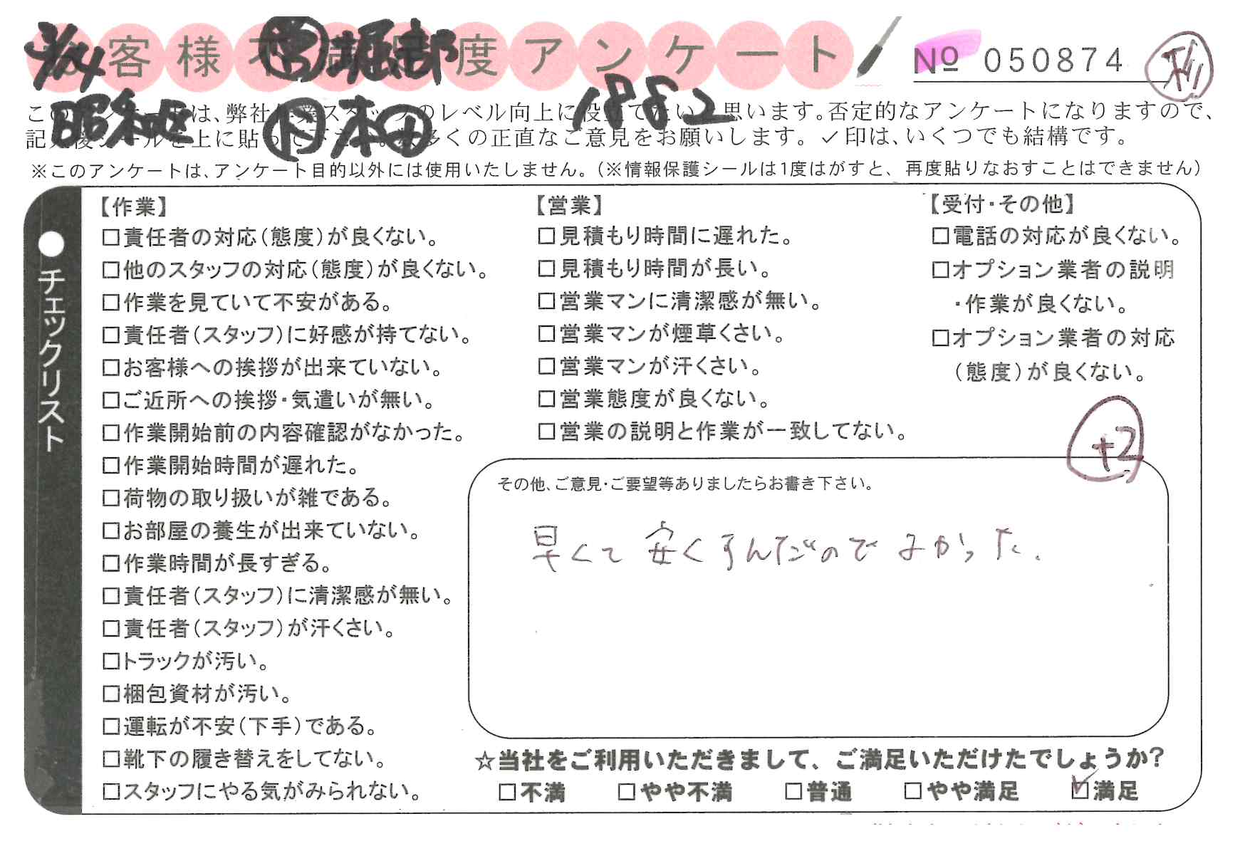 引越一番でお引越しをしていただいたお客様のうち、コメントいただいたアンケートを全て掲載しています。