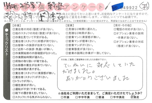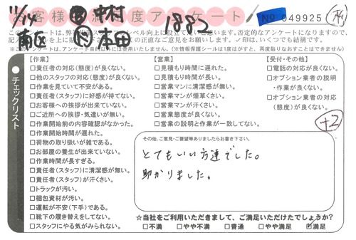 引越一番でお引越しをしていただいたお客様のうち、コメントいただいたアンケートを全て掲載しています。