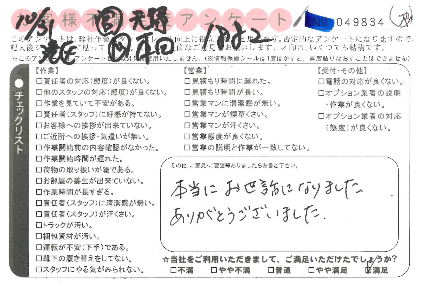 引越一番でお引越しをしていただいたお客様のうち、コメントいただいたアンケートを全て掲載しています。