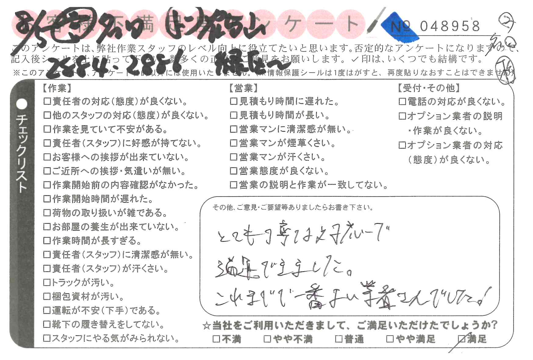 引越一番でお引越しをしていただいたお客様のうち、コメントいただいたアンケートを全て掲載しています。
