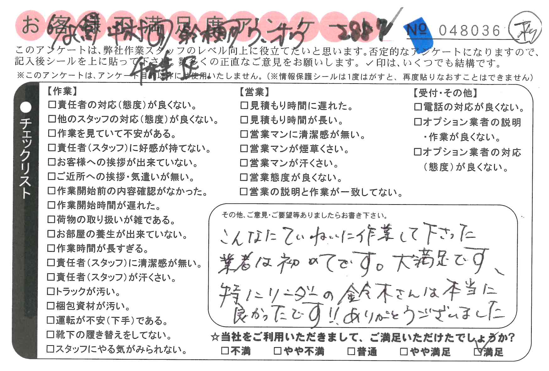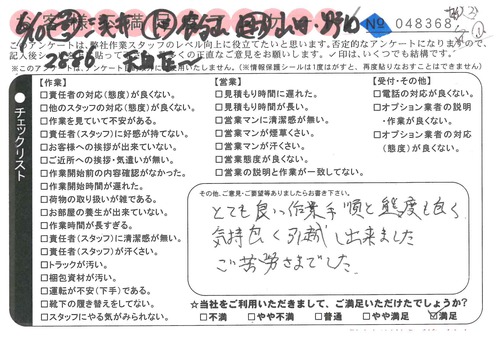 引越一番でお引越しをしていただいたお客様のうち、コメントいただいたアンケートを全て掲載しています。