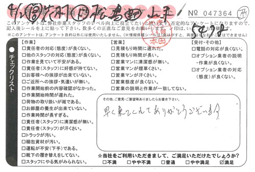 4/3 引越 営業:花村 ドライバー:松嶋 スタッフ:山末* 特に不満はありません。