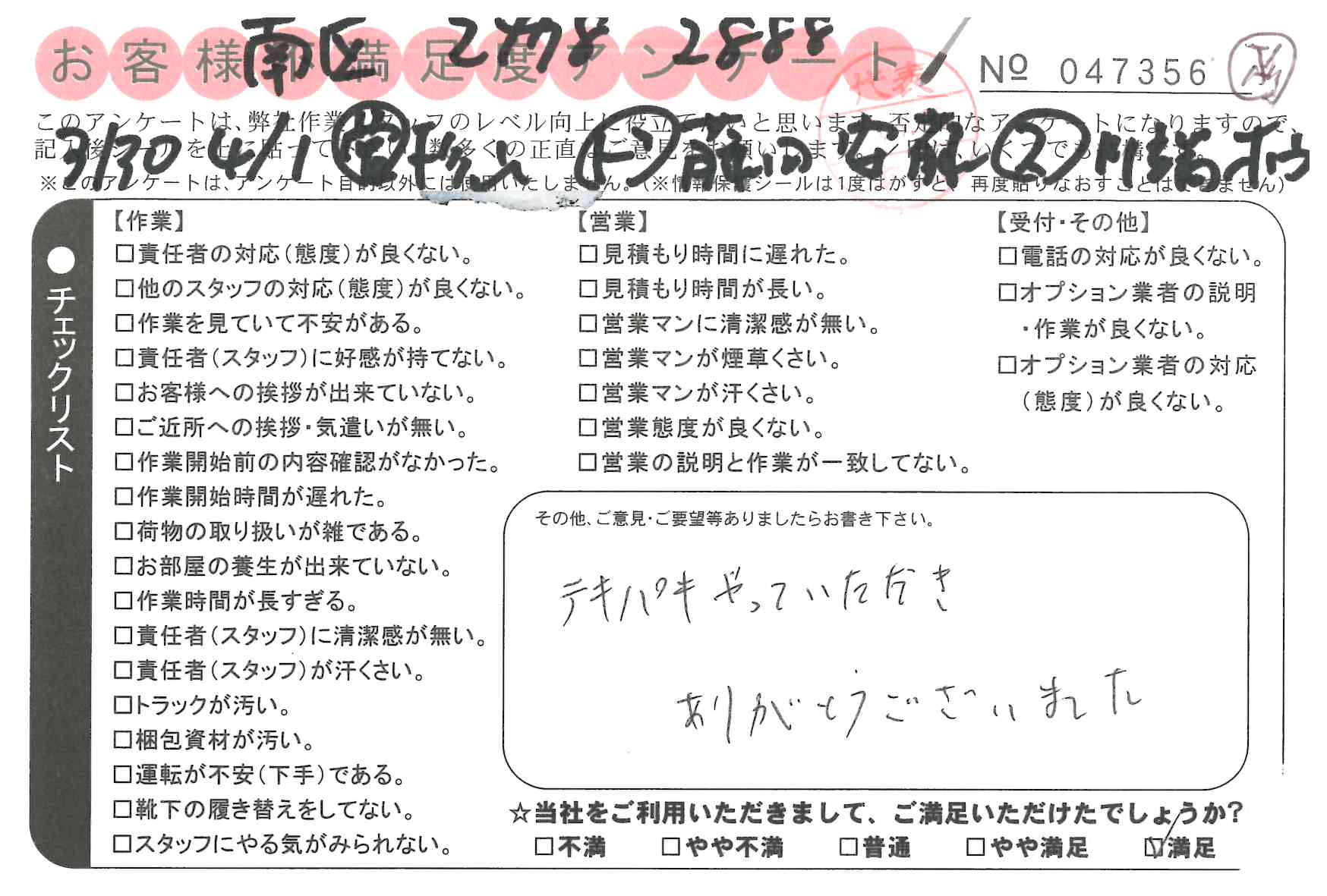 3/30 引越 営業:杉山 ドライバー:鈴木 スタッフ:石川* 早くて助かりました。