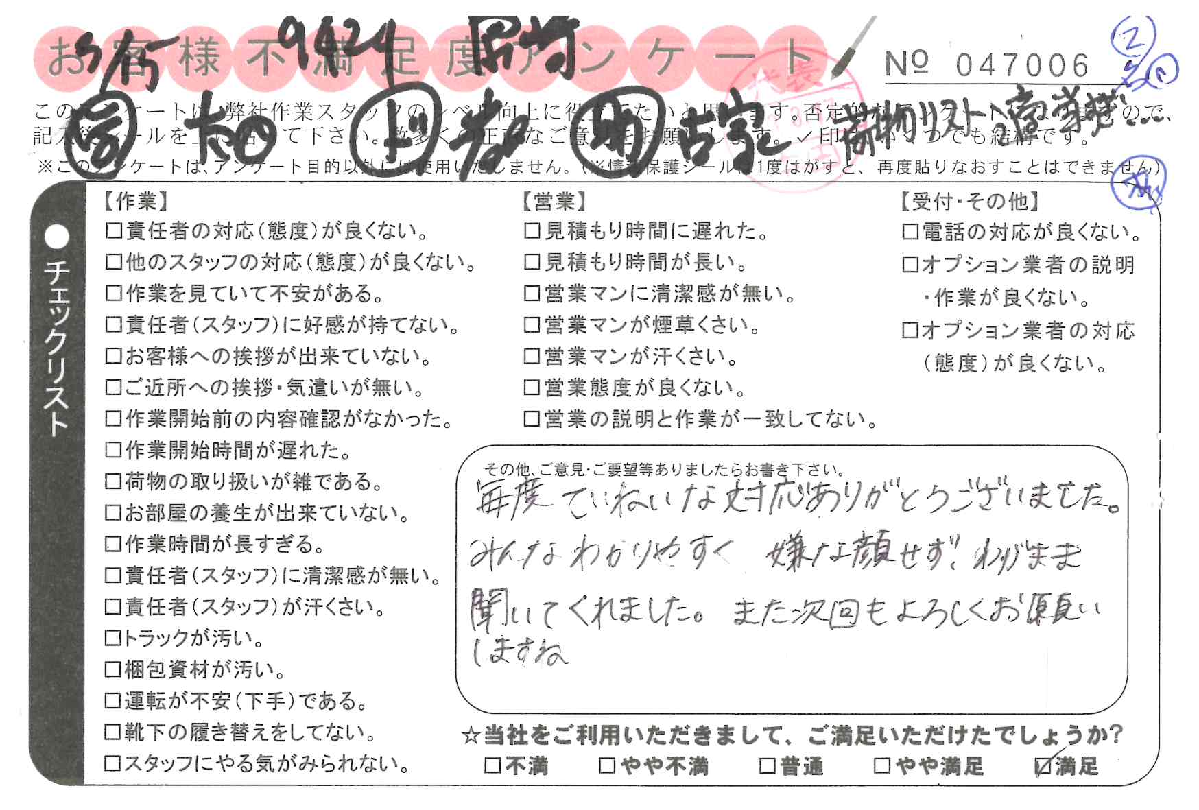 引越一番でお引越しをしていただいたお客様のうち、コメントいただいたアンケートを全て掲載しています。