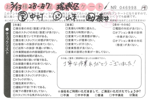 3/13 引越 営業:花村 ドライバー:川村 スタッフ:渡辺* 迅速に作業いただいて大変助かりました。